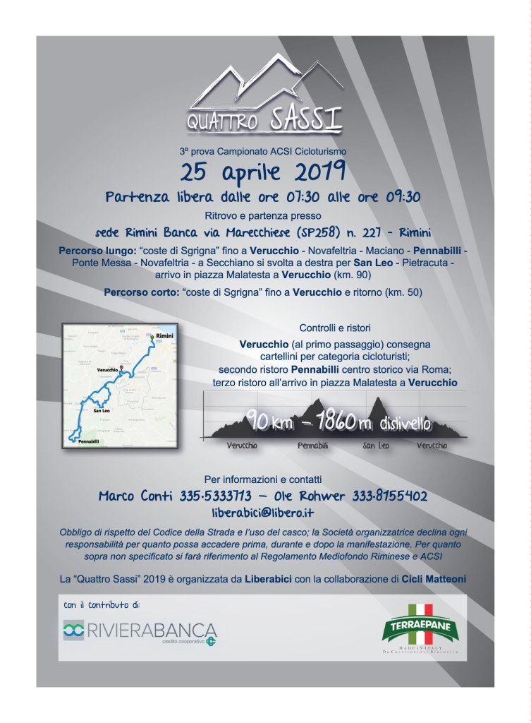 Fremono i preparativi per la imminente Quattro Sassi, cicloturistica di circa 100 chilometri che si snoderà lungo la Valmarecchia il prossimo 25 aprile.